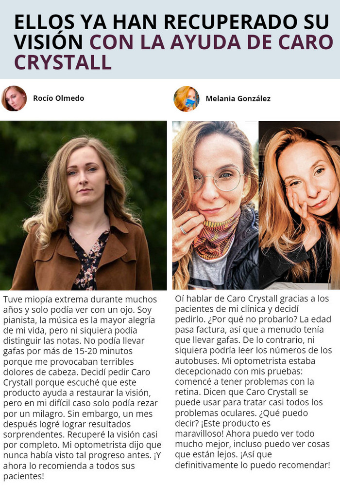 Afortunadamente, hoy en día existe un remedio que puede restaurar la capacidad perdida de ver bien. Caro Crystall – las cápsulas para restaurar la visión le permiten restaurar rápidamente la claridad de la percepción visual. Después de un tratamiento completo, una persona podrá olvidarse de lentes y anteojos, evitando la necesidad de una intervención quirúrgica.
