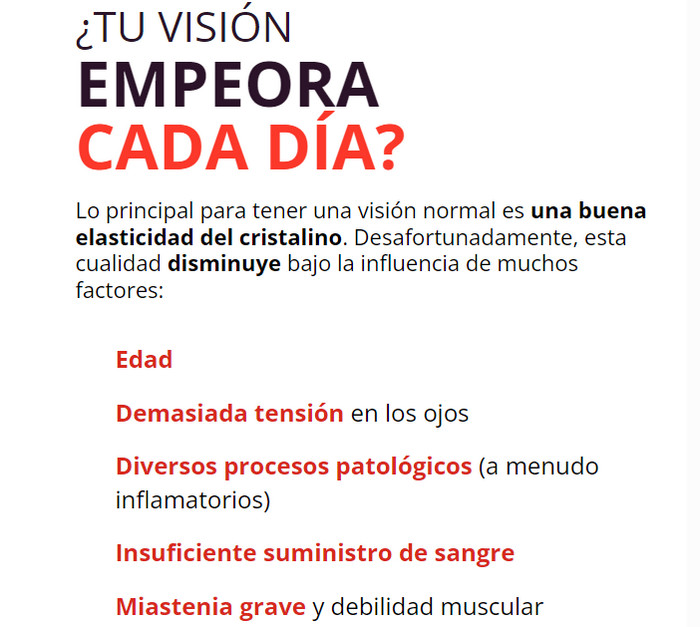 El medicamento proporciona no solo un resultado rápido, sino que también protege los ojos del estrés, los irritantes externos y los cambios relacionados con la edad. Esto se ve facilitado por componentes bien elegidos.
