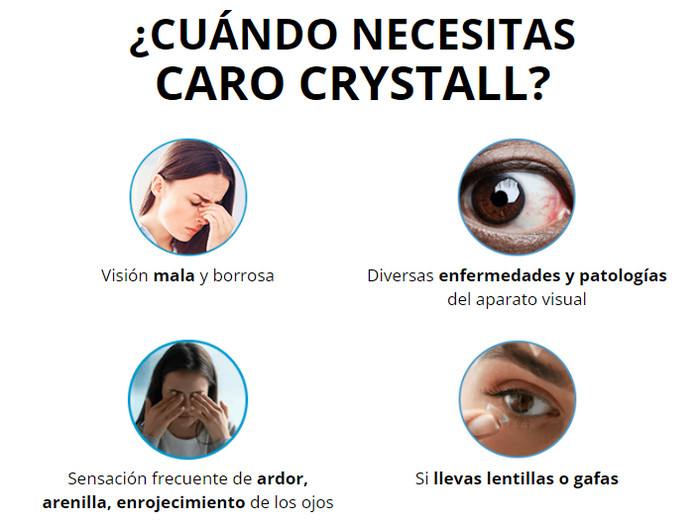 Caro Crystall elimina tanto trastornos graves en el funcionamiento de los órganos de la visión como simplemente sensaciones desagradables. Con el uso regular, el remedio restaura la visión durante mucho tiempo.