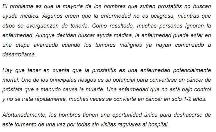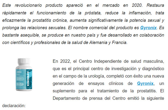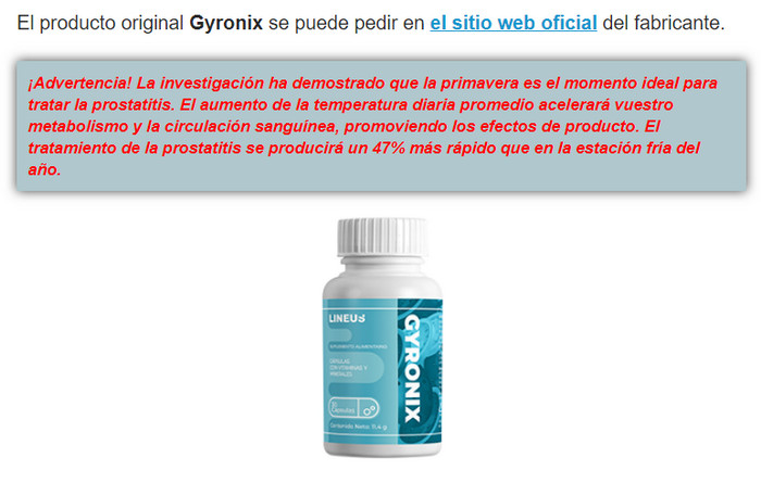 Uno de los problemas graves del sexo fuerte es la inflamación de la próstata. Anteriormente, esta enfermedad se consideraba relacionada con la edad, en este momento, los pacientes de los urólogos son cada vez más jóvenes. Gyronix de la prostatitis vendrá al rescate, tanto en la etapa inicial como en situaciones avanzadas. Con un producto innovador, que, desafortunadamente, no se vende en las farmacias comunes, puede vencer fácilmente la enfermedad. Los ingredientes naturales del producto comienzan a actuar inmediatamente. La condición de la próstata se normaliza y puede sentir alivio muy rápidamente. No le molestarán los problemas de erección o micción: todas las funciones se restablecerán por completo.