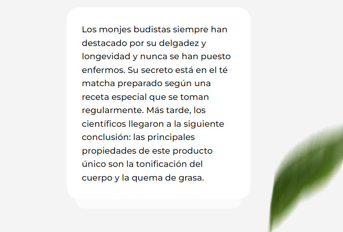 Se han estudiado las propiedades de limpieza y quemagrasas de más de 2000 alimentos para crear Matcha Slim. Basándose en estos datos, los nutricionistas han creado un complejo de desintoxicación único que funciona a la perfección.