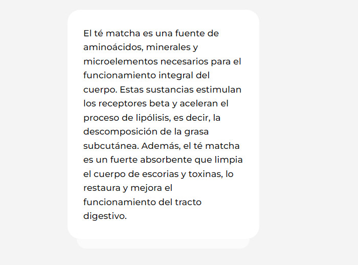 Los productos Matcha Slim inician el proceso de limpieza del cuerpo y descomposición de las células grasas. El complejo de sustancias activas inicia el trabajo de los intestinos, como un motor. Esto significa que no hay pesadez en el estómago, hinchazón, irritabilidad debido al bienestar en la corriente. La comida entrante se digiere rápidamente sin almacenarse en grasa