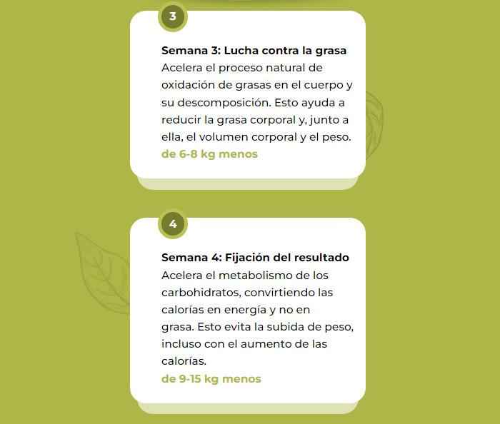 El complejo natural le permite poner en orden la figura sin recurrir a una educación física agotadora, dietas poco saludables. Satura el cuerpo con sustancias curativas, lo que tiene un efecto beneficioso sobre el funcionamiento de los órganos internos. Sin riesgos de uso.