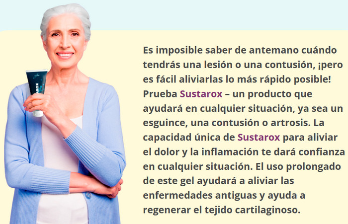 Sustarox – ungüento para el tratamiento y prevención de enfermedades articulares. Tiene una composición natural, un mínimo de contraindicaciones, no causa efectos secundarios. Elimina rápidamente el dolor y el «crujido» en las articulaciones, la hinchazón de los tejidos blandos. Aplica para cursos.