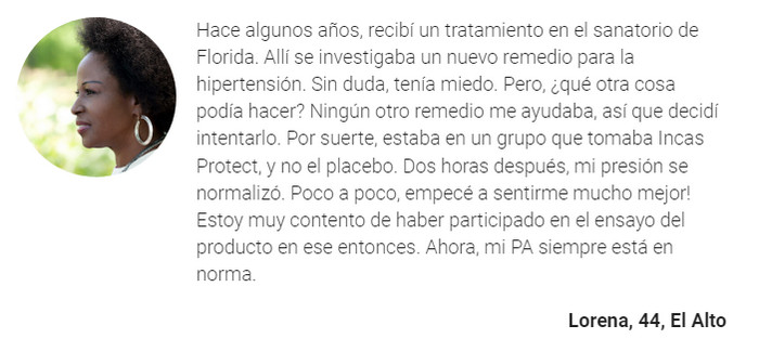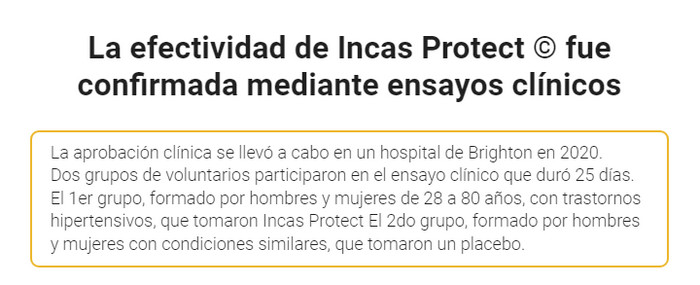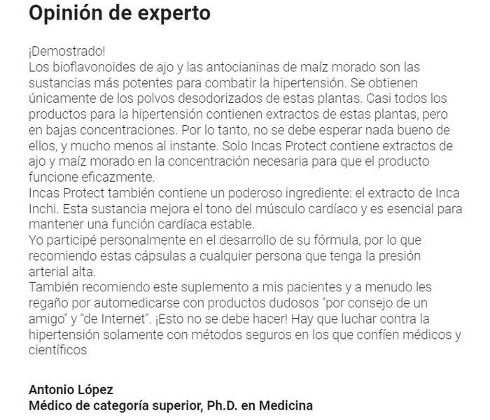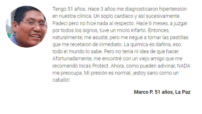 El medicamento ha obtenido una gran cantidad de comentarios positivos de personas que, con la ayuda de Incas Protect, lograron vencer la enfermedad y regresar a una vida normal y plena. Recibió la aprobación de la Asociación Internacional de Cardiología y las mejores recomendaciones de los médicos de las principales clínicas. Ha pasado estudios clínicos de varias etapas, tiene licencias, garantías y certificados de calidad. Sin riesgos de uso.