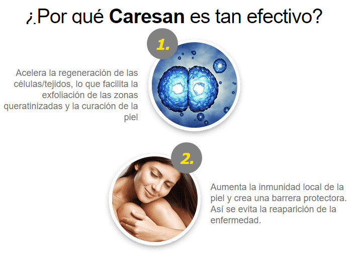 - Complejo efecto positivo sobre la epidermis. Caresan de la psoriasis restaura la integridad de la piel, elimina el enrojecimiento, pápulas, pústulas, descamación, calma, cura, mejora la inmunidad de la dermis. Debido a esto, elimina eficazmente la psoriasis.