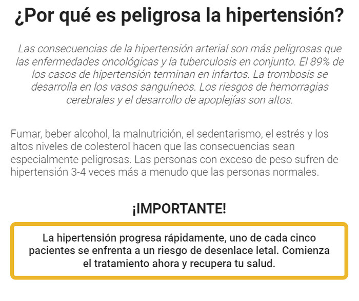 La presión arterial alta, o hipertensión, es una enfermedad terrible que provoca el riesgo de desarrollar enfermedades del hígado y los riñones, el corazón y los vasos sanguíneos, derrames cerebrales y ataques al corazón. El número de pacientes que se quejan de presión arterial alta en Rusia es de más de 40 millones. ¡Estadísticas sin principios afirman que esta cifra era 10 veces menor hace 30 años! Para reducir la tasa de aumento de la incidencia, se han desarrollado cápsulas antihipertensivas Carditone que proporcionan reducción de la presión.