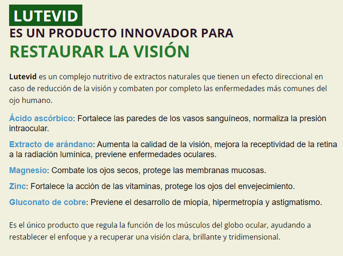 El medicamento Lutevid para los ojos es una alternativa indolora y altamente efectiva Lutevid a la terapia y la intervención quirúrgica, un desarrollo sensacional de científicos de Japón. La singularidad del nuevo medicamento radica en una combinación especial de componentes: extractos de plantas, que en el menor tiempo posible brinda un progreso sorprendente en la restauración de la visión. La base de la formulación del medicamento es: