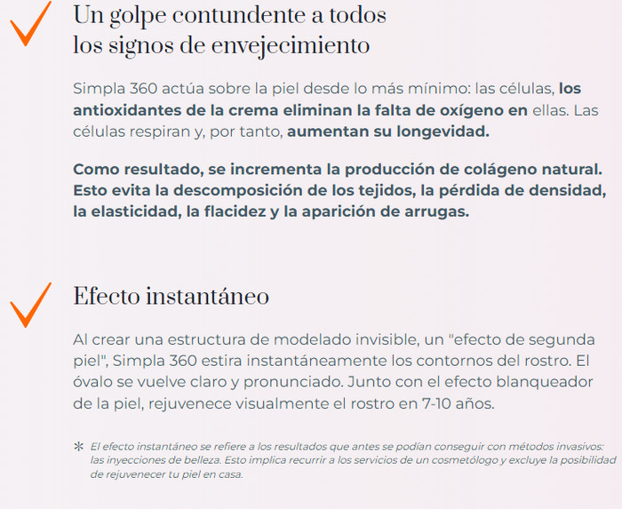 Serum Simpla 360 es una alternativa económica a la cirugía plástica, que brinda resultados no menos hermosos y rápidos, pero sin el riesgo de complicaciones. tu piel recuperará la elasticidad, frescura y belleza perdidas en tan solo un mes de uso del producto. Al mismo tiempo, no habrá daños ocultos y evidentes en él, y el riesgo de obtener un resultado inesperado, como es el caso de un estiramiento facial, será cero.