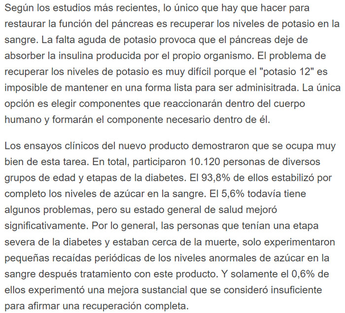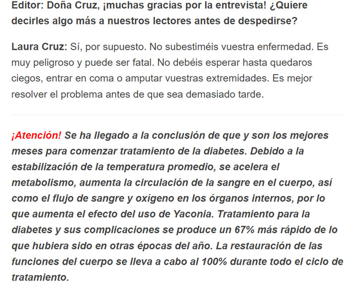 Los diabéticos corren el riesgo de sufrir discapacidad visual, enfermedades de la piel y el desarrollo de úlceras tróficas. Muchos medicamentos de la farmacia eliminan los síntomas, pero no restauran el trabajo del páncreas. Yaconia – cápsulas naturales que ayudan a eliminar completamente la diabetes en 1 curso de tratamiento. La composición a base de hierbas tiene como objetivo mejorar el trabajo del páncreas y estimular la producción de insulina. Al mismo tiempo, todos los procesos transcurren sin problemas, una persona está protegida contra la hipoglucemia (una fuerte disminución del azúcar en la sangre debido a la producción intensiva de la hormona inulina).