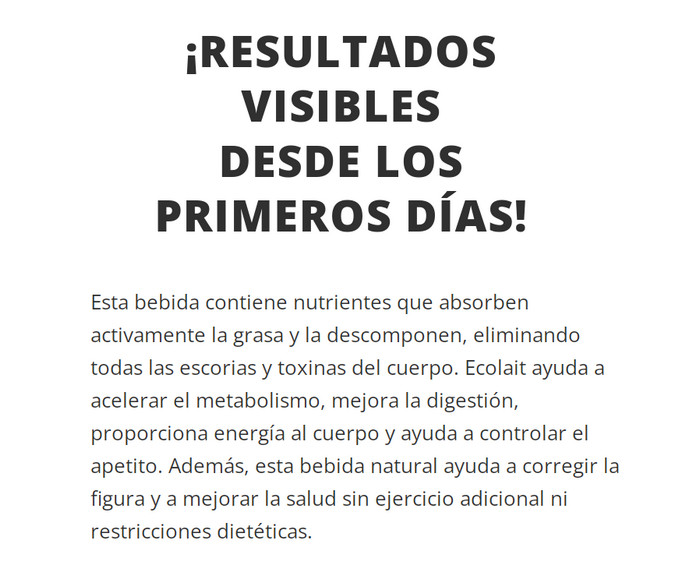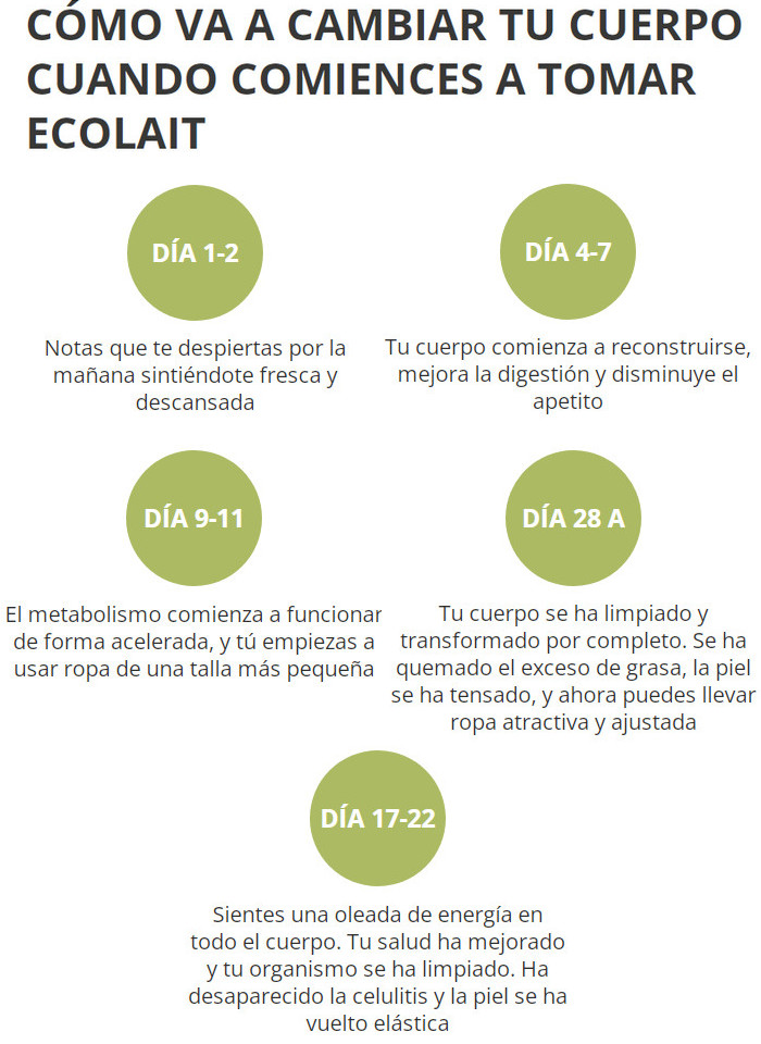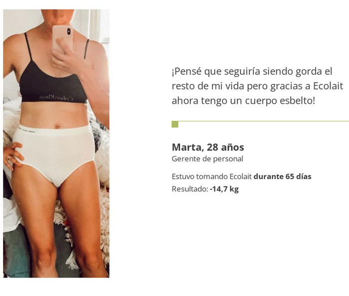 La composición armoniosa se ha convertido en una base sólida para el éxito. La dinámica positiva comenzará a relajarse casi de inmediato, tan pronto como las primeras cápsulas adelgazantes Ecolait comiencen a funcionar.