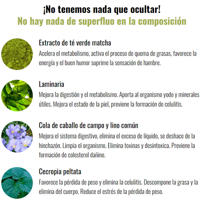 ¿Cómo ocurre la pérdida de peso? En el proceso de uso de Matcha Slim se activa el metabolismo, los trastornos metabólicos se vuelven cosa del pasado. La absorción de nutrientes de los alimentos bajo la influencia de la droga aumenta y, por el contrario, disminuye la absorción de grasas y agua. El cuerpo se libera de toxinas dañinas acumuladas y toxinas tóxicas. Debido a los suplementos dietéticos, la hinchazón y los pliegues feos en las áreas problemáticas del cuerpo desaparecen, creando la ilusión de depósitos de grasa debido al exceso de líquido en ellos. Matcha Slim normaliza el proceso de digestión y resuelve una serie de problemas relacionados: elimina la acidez estomacal, el aumento de la formación de gases en los intestinos y los trastornos gástricos. Bajo la influencia de este fármaco, aumenta el peristaltismo intestinal y el vaciado del órgano principal del tracto gastrointestinal se lleva a cabo de manera suave y oportuna.