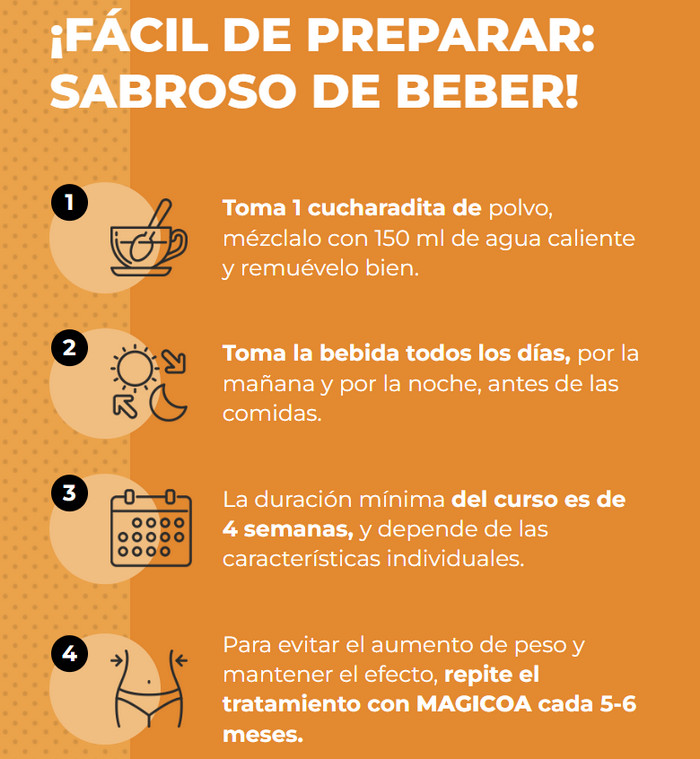 Magicoa – multicóctel intensivo para adelgazar exprés y depurar el cuerpo. Los elementos activos comienzan a actuar desde el sistema digestivo, inhibiendo la absorción de calorías y adsorbiendo toxinas. Extendiéndose por todo el cuerpo, la droga actúa destructivamente sobre la grasa corporal, incluida la grasa visceral. Las células grasas se convierten en energía y las toxinas se eliminan del cuerpo.