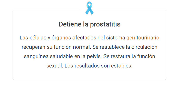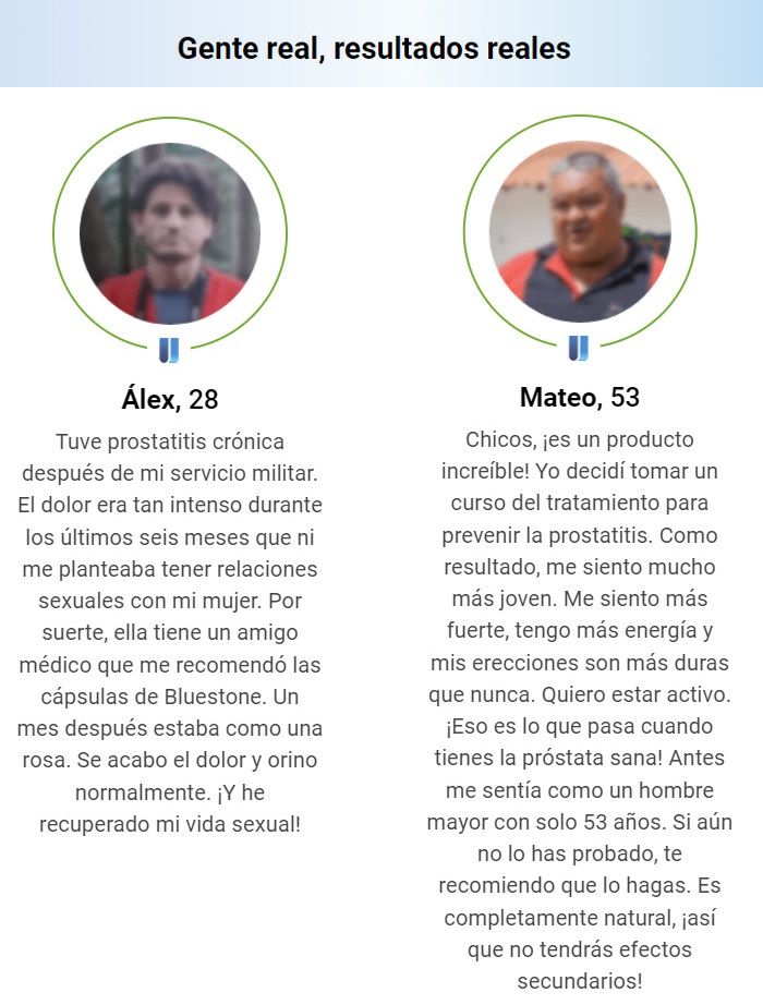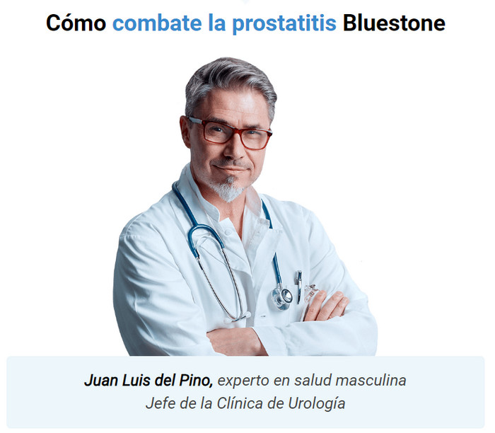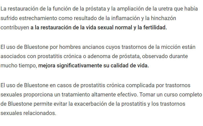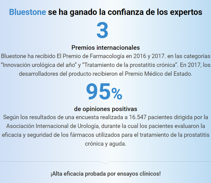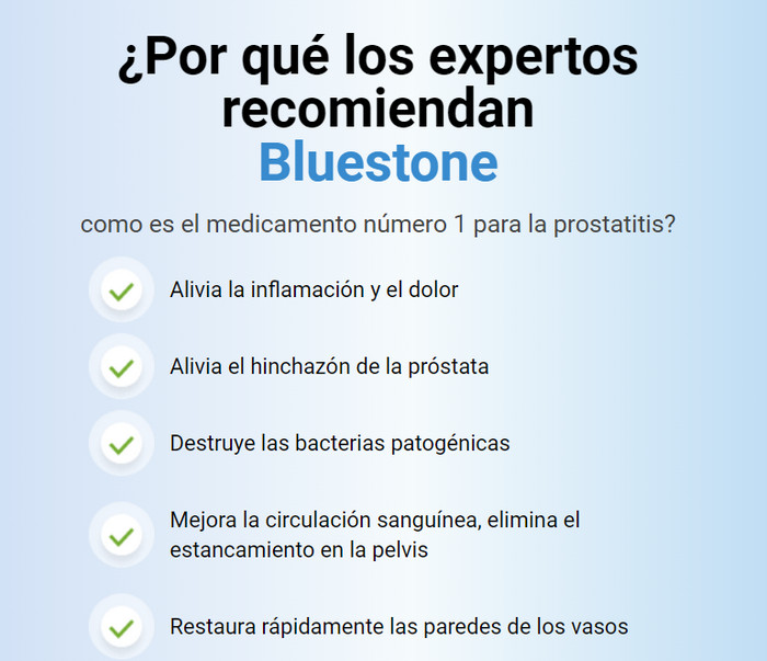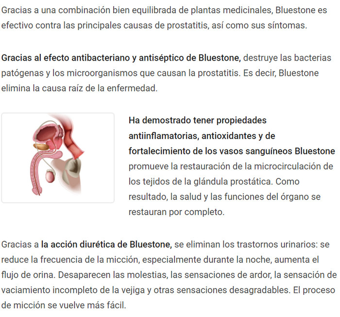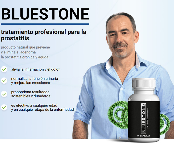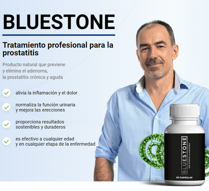 La droga Bluestone se llama un remedio revolucionario para la prostatitis crónica. Este medicamento, creado a base de ingredientes naturales, estimula la regeneración natural del tejido prostático y elimina los principales síntomas de la enfermedad en un corto período de tiempo. Con la ayuda de Bluestone, no solo puede eliminar el proceso inflamatorio, sino también mejorar significativamente la calidad de la vida sexual: muchos componentes de la droga son afrodisíacos naturales que mejoran la fuerza sexual en los hombres. Para comprar Bluestone, simplemente haga un pedido en nuestro sitio web: le enviaremos el medicamento por correo o mensajería.