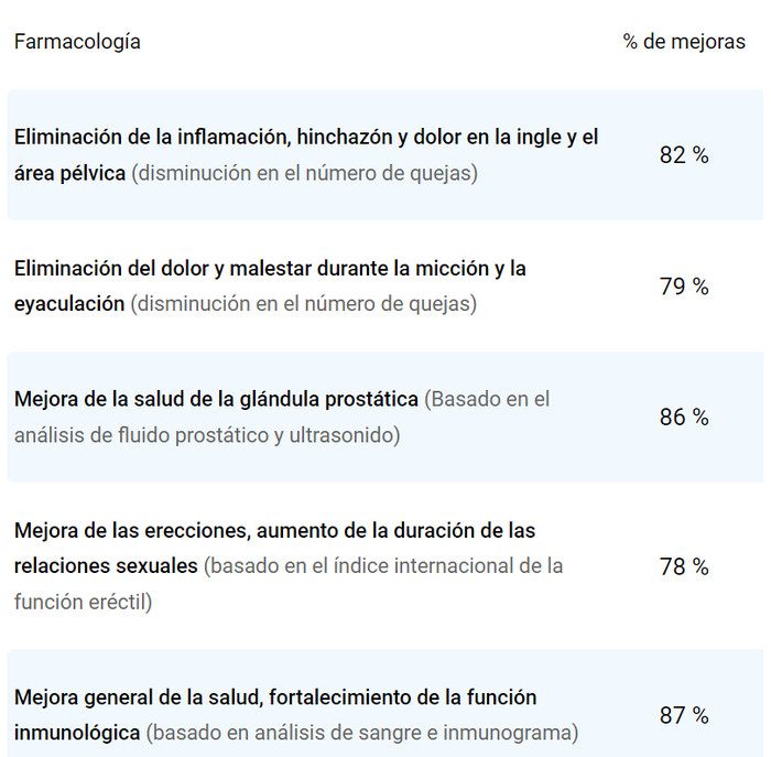 Según los resultados de estudios realizados en centros médicos de Europa, el remedio Bluestone ayudó a eliminar por completo los síntomas de la prostatitis crónica en el 98% de los hombres mayores de 40 años. mientras que solo el 0,5% de los pacientes carecía por completo de efecto terapéutico.