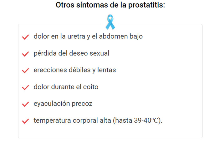Signos similares de prostatitis pueden persistir permanentemente, pero con mayor frecuencia empeoran una vez cada 4 a 6 meses y desaparecen en una semana, por lo que los hombres creen que todo «pasó por sí solo», pero esto no es así. La inflamación crónica de la próstata con el tiempo conduce a una disminución en el nivel de testosterona en el cuerpo, por lo que no solo el área genital comienza a sufrir, sino todo el cuerpo.