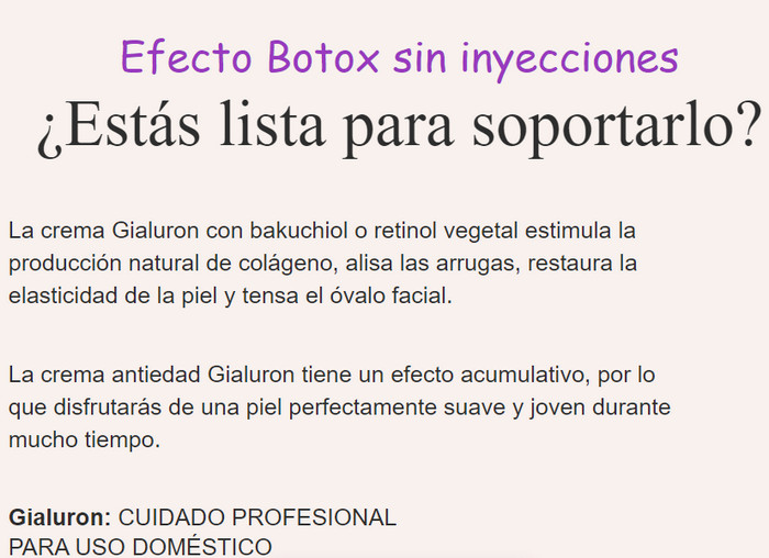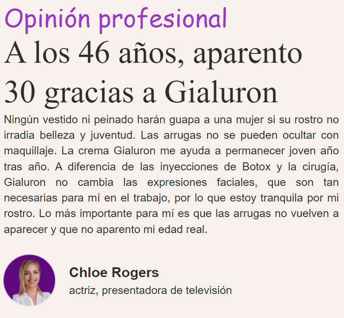 Es muy difícil restaurar la juventud y la claridad de los contornos con métodos conservadores, especialmente si la edad ya ha superado los 40 años y la cirugía plástica se percibe como demasiado costosa. La única alternativa que combina la eficacia de la cirugía plástica y la disponibilidad de los cosméticos convencionales es el complejo semanal de rejuvenecimiento de la piel Gialuron, que se ha puesto a la venta hace relativamente poco tiempo. Esta herramienta literalmente empuja las arrugas desde el interior y transforma el rostro, haciéndolo 10 años más joven en solo 7 días.
