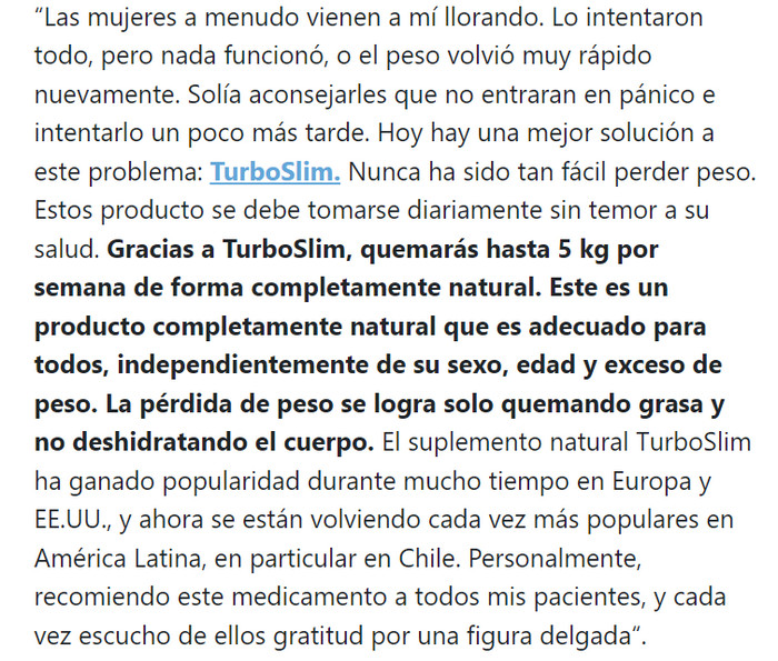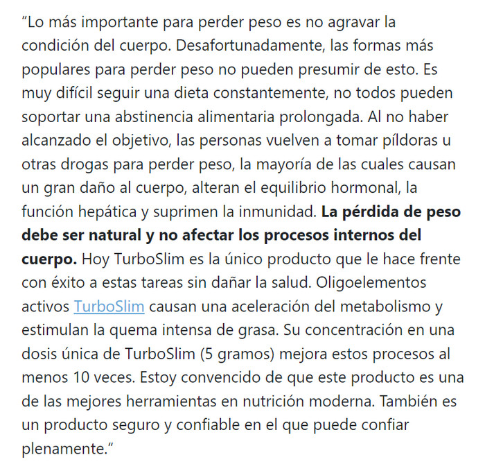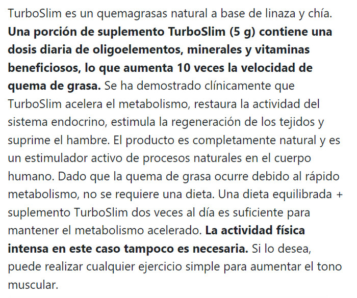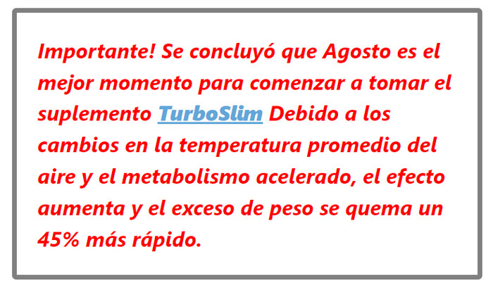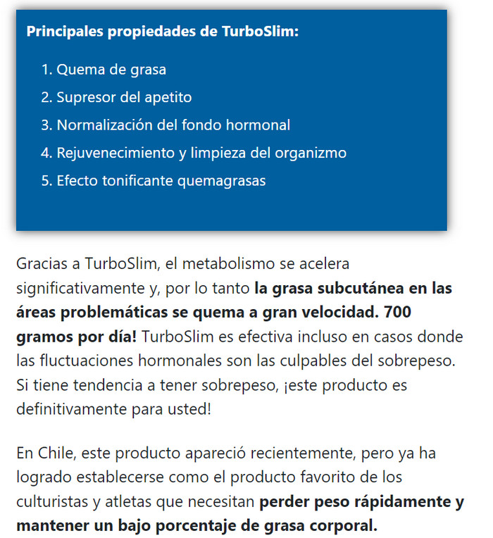 Veamos qué es TurboSlim, cómo funciona el medicamento, cómo usarlo de acuerdo con las instrucciones de uso, donde comprar TurboSlim, donde la venden y cuál es su precio en Peru, y cuáles son las ventajas del producto. En los foros analizaremos testimonios, comentarios y opiniones sobre TurboSlim.