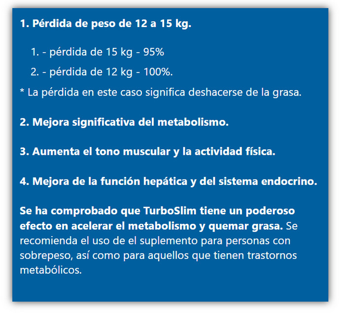 - Efecto complejo. TurboSlim para bajar de peso tiene propiedades quemagrasas, metabólicas, de drenaje linfático, tonificantes, antioxidantes, inmunomoduladoras y fortalecedoras en general. Gracias a una acción tan compleja, esta droga no solo corrige la silueta, sino que también normaliza todos los procesos en el cuerpo.
