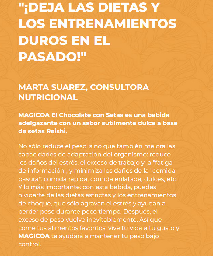 Magicoa – bebida en forma soluble, que tiene intensas propiedades desintoxicantes. Su gran ventaja es la composición natural, por lo que el producto no provoca ningún cambio negativo en el cuerpo. Tenga en cuenta que Magicoa es efectivo solo con un uso de regular, por lo tanto, si desea corregir el peso corporal, ¡tómelo a diario, no ocasionalmente!