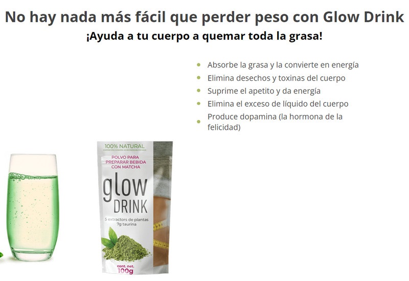 Glow Drink – un complejo único para la limpieza y la pérdida de peso Glow Drink tiene propiedades antioxidantes, elimina toxinas y productos de degradación nocivos del cuerpo. Los componentes vegetales de la composición eliminan el exceso de líquido, descomponen los depósitos de grasa, aceleran el metabolismo, mejoran el funcionamiento de los sistemas digestivo y circulatorio, reducen los niveles de colesterol en sangre, controlan el apetito y el hambre.
