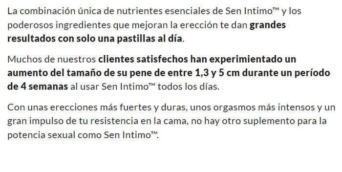 Las garantías de que el tamaño no importa son inherentemente falsas. Al mismo tiempo, tampoco vale la pena atormentarse y sufrir por un pene pequeño, porque ahora cualquier hombre tiene la oportunidad de mejorar sus características de rendimiento. Usando Sen Intimo para agrandar tu pene lograrás mucho: