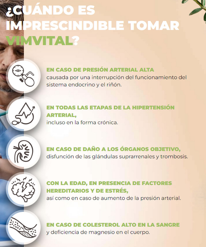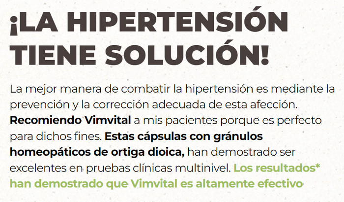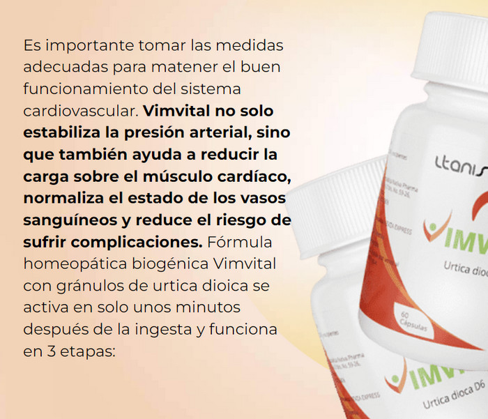 La prevención de la hipertensión con comprimidos matutinos y vespertinos Vimvital es un nuevo método para combatir la enfermedad. Una característica distintiva de la terapia es la estabilización de la presión mediante la activación de las fuerzas naturales del cuerpo. Las revisiones positivas de médicos y usuarios confirman la eficacia de las tabletas Vimvital contra la hipertensión; la composición natural hace que el uso del producto sea seguro. Puedes comprar Vimvital en la web oficial del fabricante a un precio atractivo. El producto no se suministra directamente a las farmacias, sólo a través de intermediarios, lo que multiplica el coste.