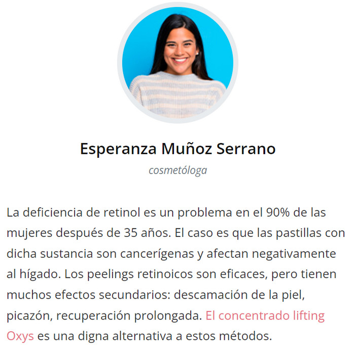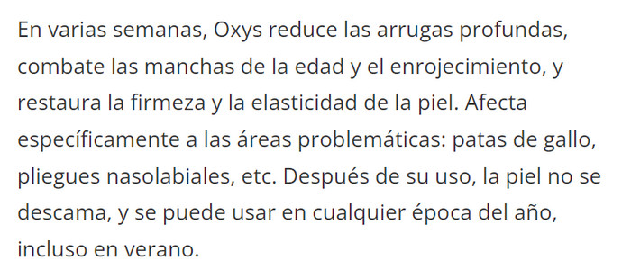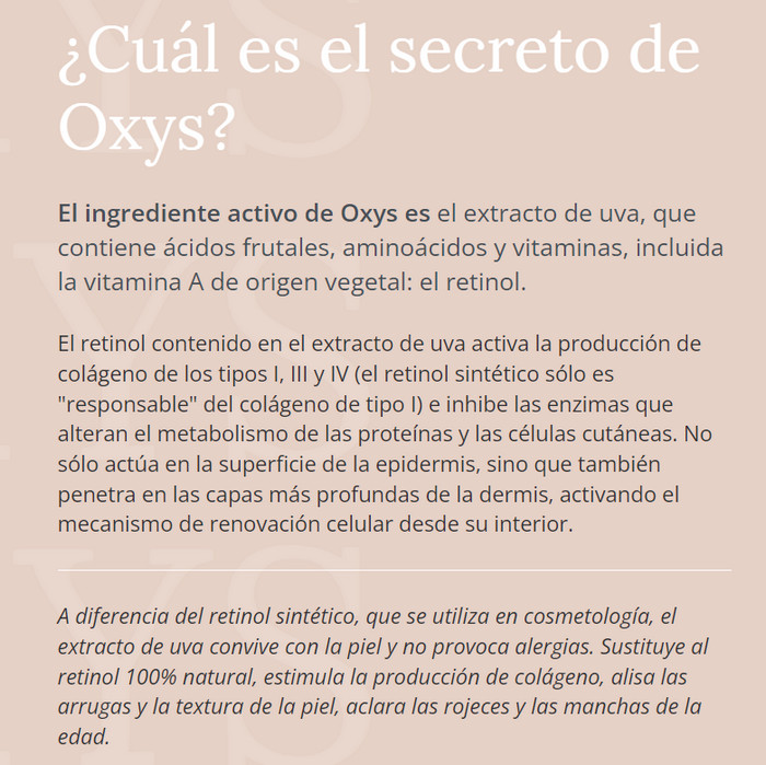 Oxys − este es un producto cosmético de lujo. En la producción se utilizan materias primas selectas y tecnologías respetuosas. Esto garantiza una alta calidad del producto, el efecto de la aplicación es comparable al de las inyecciones de belleza: