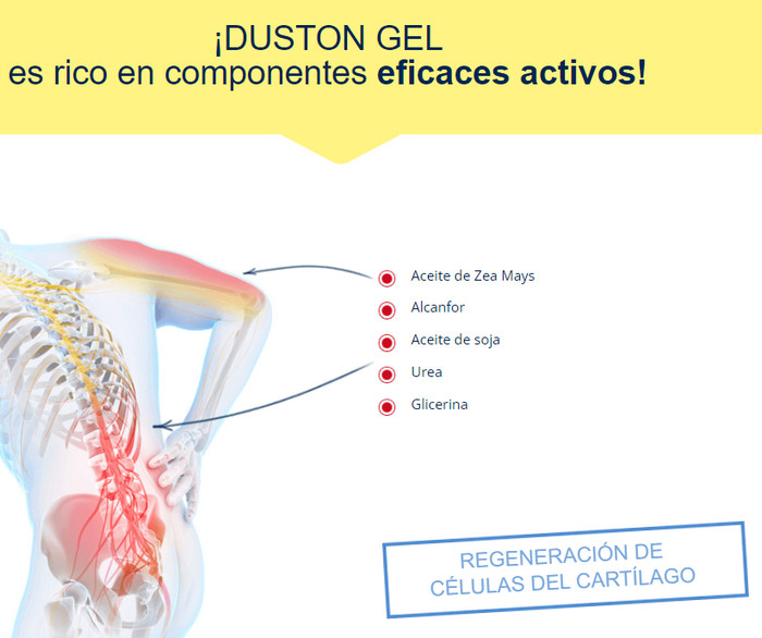 La principal propiedad de la crema Duston gel es la regeneración del tejido cartilaginoso y el alivio de los síntomas desagradables en las articulaciones. La fórmula de la crema comienza a actuar inmediatamente después de su aplicación sobre la piel y provoca los siguientes cambios: