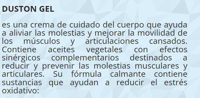 En este artículo podrás leer sobre qué es Duston gel, cómo funciona el producto y cuáles son sus beneficios sobre sus análogos en Venezuela, cómo utilizar Duston gel según las instrucciones de uso, donde comprar Duston gel, donde la venden y cuál es su precio. Lea también testimonios, comentarios y opiniones reales sobre Duston gel en los foros.