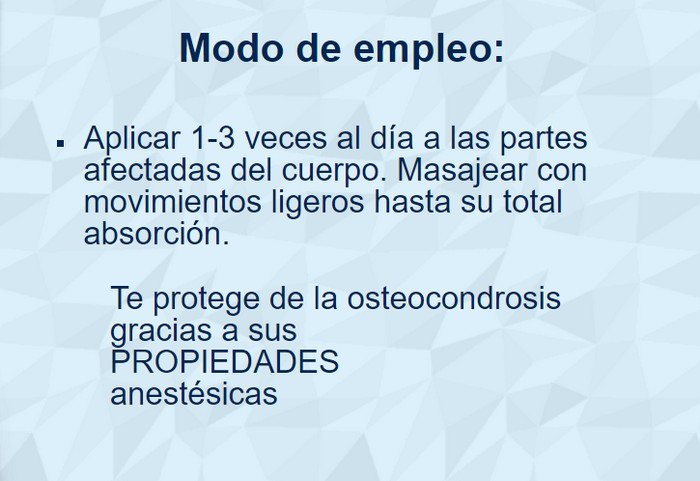 - Los nutrientes de la crema saturan las superficies cartilaginosas de la articulación, restauran su estructura, fortalecen y previenen una mayor destrucción.