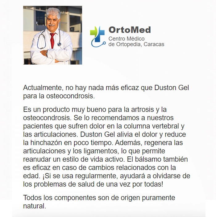 El exceso de peso y la hipotermia también tienen un impacto negativo en el estado de las articulaciones. Hoy en día, cada persona se enfrenta a casi todos estos factores, de ahí las tristes estadísticas. Los médicos realizaron recientemente un estudio y descubrieron que más del 50% de los residentes del país padecen problemas musculoesqueléticos. De ellos, aproximadamente la mitad aborda la prevención de manera incorrecta y finalmente desarrolla formas crónicas. El fabricante de Duston gel decidió corregir la situación sacando al mercado el resultado de su largo trabajo en el laboratorio.