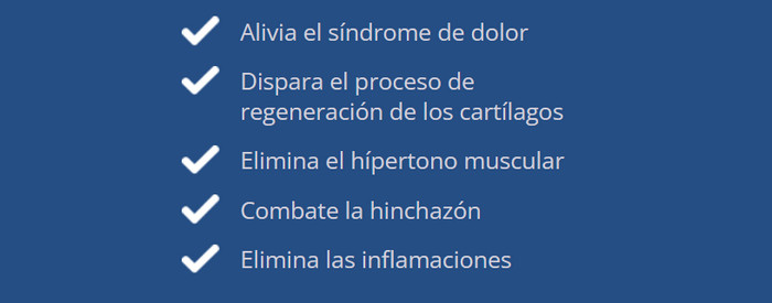 La pomada favorece la renovación del tejido cartilaginoso y estimula la producción de líquido sinovial, que actúa como una especie de «lubricante» natural. Los componentes individuales aumentan la fuerza y la elasticidad de ligamentos y tendones. También se restablece el metabolismo mineral, se regeneran todos los tejidos dañados. La funcionalidad de la articulación vuelve completamente a la normalidad.