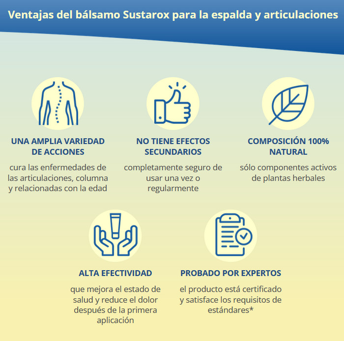 En conjunto, los ingredientes naturales Sustarox tienen un efecto analgésico y antiinflamatorio pronunciado. Desde los primeros días del curso desaparecen todos los síntomas negativos. En unos pocos días, la movilidad articular mejora significativamente. Incluso con ejercicio intenso, las molestias físicas no te molestan. Además, se normaliza la circulación sanguínea y se detienen los procesos degenerativos.