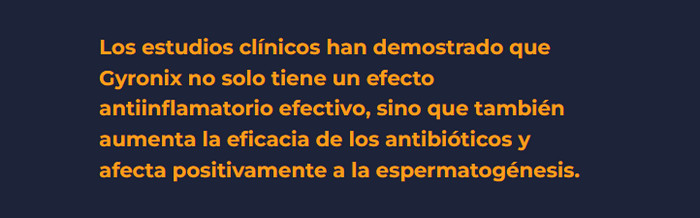Los científicos del Instituto de Reproductología llevan muchos años trabajando para resolver el problema de la incidencia generalizada de prostatitis en hombres mayores de 40 años. Resultó que esto se basa no sólo en la propagación de infecciones de transmisión sexual, la incapacidad de prevenir los resfriados y la predisposición hereditaria, sino también en las características nutricionales y de estilo de vida de la gente moderna. Gyronix contiene sólo componentes e ingredientes naturales.