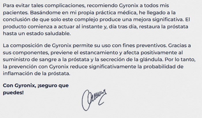 Los médicos dan críticas inequívocamente positivas sobre Gyronix, sus opiniones se basan en la multifuncionalidad del producto, ya que tiene un efecto positivo en la salud del sistema genitourinario. Los médicos creen que sin este producto natural sería más difícil alivia la disfunción urinaria.