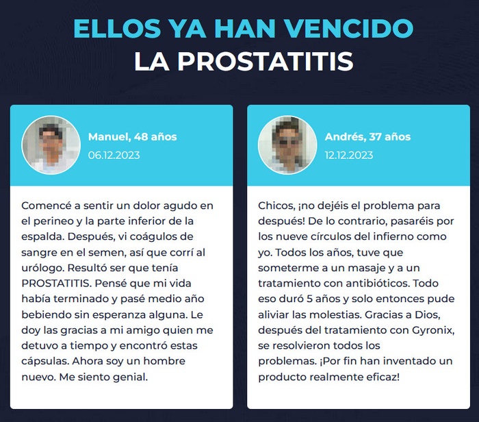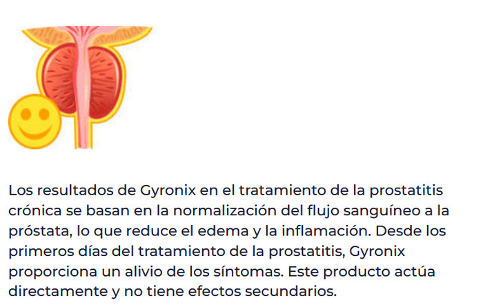 «Carreras» frecuentes al baño, dolores dolorosos, incapacidad en la cama: todas estas son consecuencias de la prostatitis que, según las estadísticas, afecta a uno de cada tres hombres mayores de 40 años. Un producto Gyronix cuyo precio es inferior al de los productos habituales para la prostatitis le ayudará a recuperar una excelente salud y el interés por el sexo. El producto elimina la enfermedad subyacente y actúa como un estimulante de potencia suave pero eficaz. Con él comienza una segunda juventud.