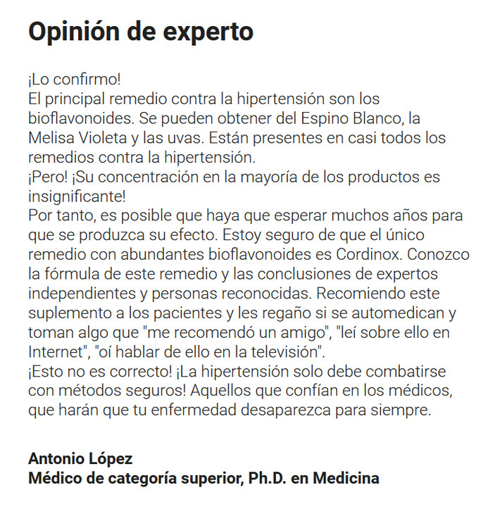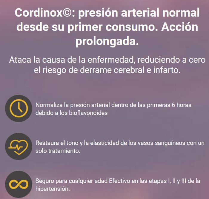 Una de las principales razones del aumento de presión es la disminución de la permeabilidad de los vasos sanguíneos debido a la obstrucción de los canales. La alteración del flujo sanguíneo provoca aumentos repentinos de la presión arterial, que pueden terminar trágicamente. La salvación de este desarrollo de eventos es la prevención oportuna de la hipertensión Cordinox: un nuevo complejo con una composición natural que no tiene efectos secundarios sobre la salud. Está indicado para jóvenes y mayores, no tiene contraindicaciones y hace que los pacientes se sientan mejor en poco tiempo.