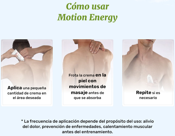 - Motion Energy afecta la causa del dolor y alivia la inflamación, a diferencia de la mayoría de los analgésicos. Por lo tanto, el dolor no volverá después de varias horas de aplicación sobre la piel.