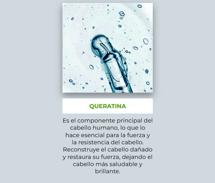 - Queratina: componente estructural importante del cabello, que puede ayudar a restaurar el cabello dañado. Rellena los microdaños en el cabello, fortaleciéndolo y haciéndolo más suave, brillante y resistente a la rotura