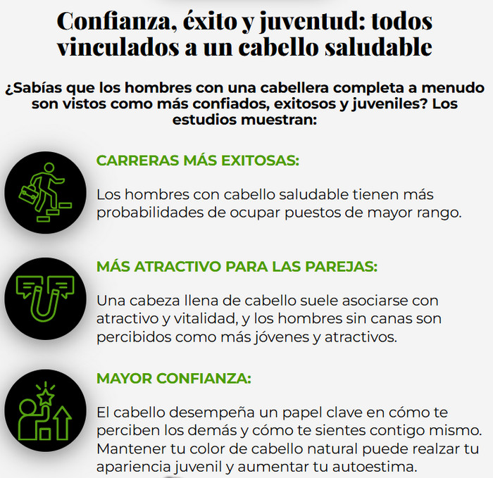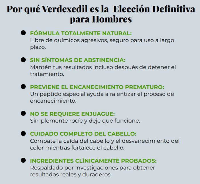 Además, Verdexedil puede ralentizar el proceso de aparición de canas, ayudando a mantener el color natural del cabello. Esto es especialmente importante para quienes notan los primeros signos de canas, ya que el producto puede ayudar a mantener la pigmentación del cabello, retrasando su aparición prematura.
