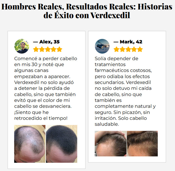 Las opiniones y testimonios sobre Verdexedil en los foros son en su mayoría positivas. Los usuarios destacan su eficacia en la lucha contra la caída del cabello y las canas. Muchos señalan que, con este producto, el cabello se vuelve más denso y fuerte, y el proceso de caída se ralentiza. Se valora especialmente la capacidad de ralentizar la aparición de canas, lo que lo hace útil para quienes enfrentan los primeros signos de canas. También se menciona la comodidad de uso: el spray se aplica fácilmente y no requiere enjuague. En general, Verdexedil ayuda a mantener la salud del cabello y a conservar su apariencia natural.