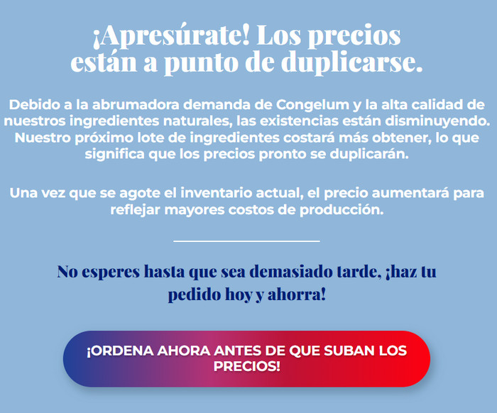 La crema Congelum está disponible solo en el pagina oficial del fabricante. Gracias a una promoción especial del fabricante, el precio de Congelum ha sido significativamente reducido. Congelum no se vende en plataformas como Amazon o Mercado Libre, ni se puede adquirir en farmacias. Para obtener la crema Congelum original a un precio favorable, encárguela únicamente a través del pagina oficial.