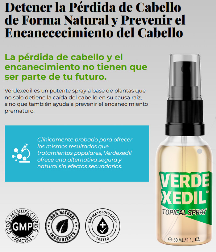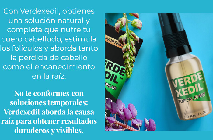 Verdexedil es un spray que puede ser un apoyo en la lucha contra la caída del cabello y la aparición prematura de canas. Su composición natural está diseñada para hidratar el cuero cabelludo, fortalecer los folículos capilares y crear condiciones favorables para conservar el color natural del cabello.