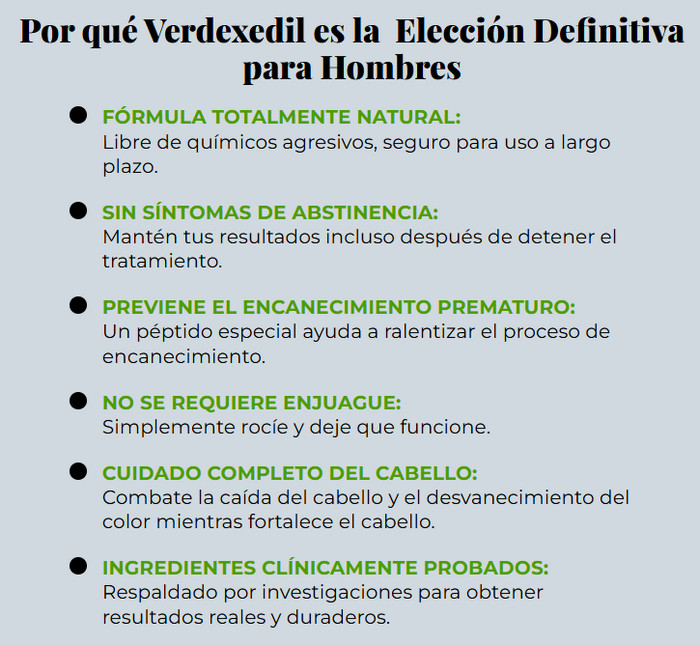 Las opiniones también subrayan que el Verdexedil puede ser útil ante los primeros signos de encanecimiento, ayudando a ralentizar el proceso de cambio de color del cabello. Los usuarios señalan que con el uso regular, el spray contribuye a fortalecer las raíces del cabello, haciéndolo más resistente a los factores externos.