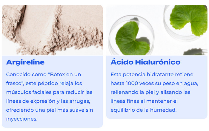 - Argirelina: Este péptido, conocido como «botox en un frasco», puede ayudar a relajar los músculos faciales, reduciendo las arrugas y pliegues finos, lo que hace que la piel sea más suave sin necesidad de inyecciones
