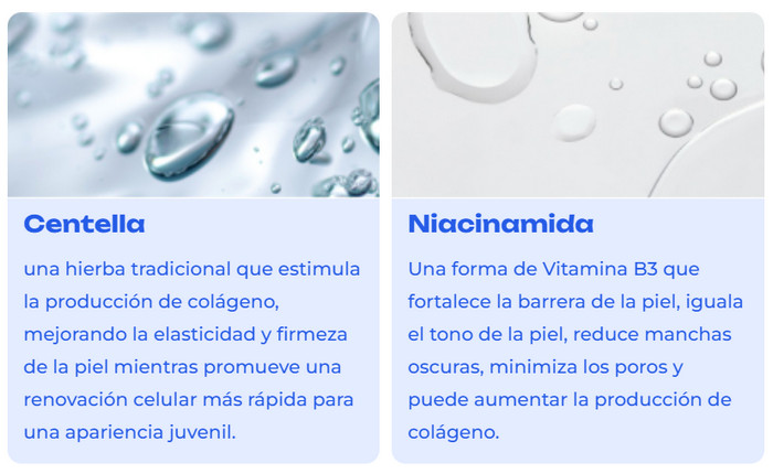 - Niacinamida: Esta forma de vitamina B3 puede fortalecer la barrera cutánea, igualar el tono de la piel, reducir manchas oscuras y minimizar los poros, así como aumentar la producción de colágeno