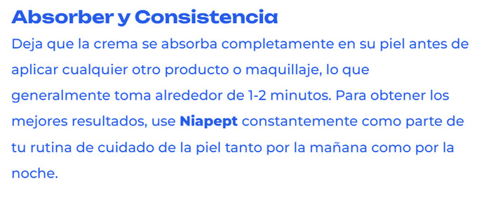 - Puede ayudar a hidratar y nutrir: Niapept proporciona una hidratación profunda, dejando la piel suave y fresca, lo cual es especialmente importante para mantener su salud