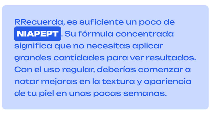 - Restauración nocturna: antes de dormir, aplica Niapept para que la piel reciba la máxima cantidad de nutrientes y se recupere durante el descanso nocturno