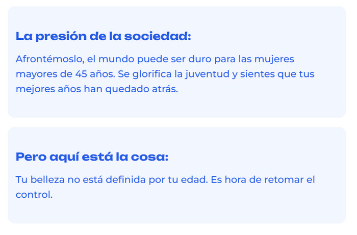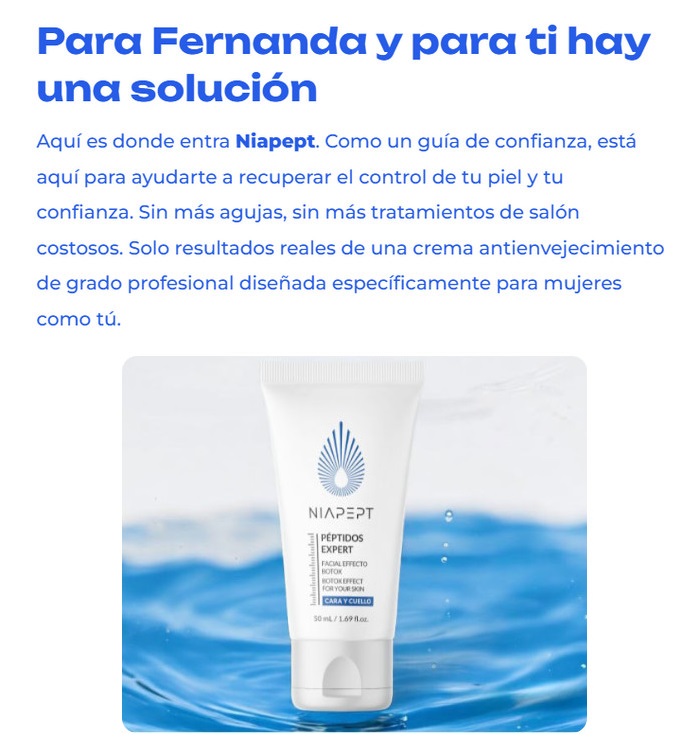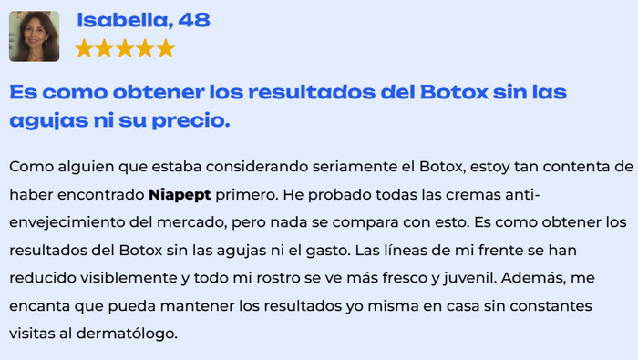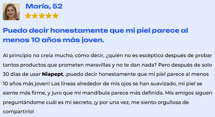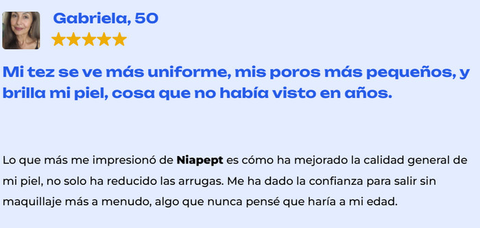 «No esperaba que una crema pudiera cambiar tanto mi concepto de cuidado de la piel. Normalmente soy escéptica con las promesas grandes, pero Niapept realmente me sorprendió. Mi piel parece más «compacta», firme, y las arrugas finas en la frente se han alisado notablemente. Ahora no solo aplico la crema, sino que me sorprendo pensando: ‘¡Qué agradable es cuidar de mí misma!’»